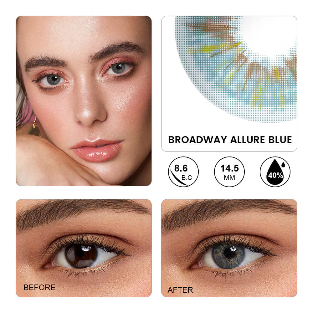 Broadway Allure Blue Contact Lenses are your ticket to capturing the timeless beauty and charm of true blue eyes. These lenses feature an enchanting ocean blue shade, enhanced by intricate brown and yellow hues at the center, creating a mesmerizing illusion of depth.