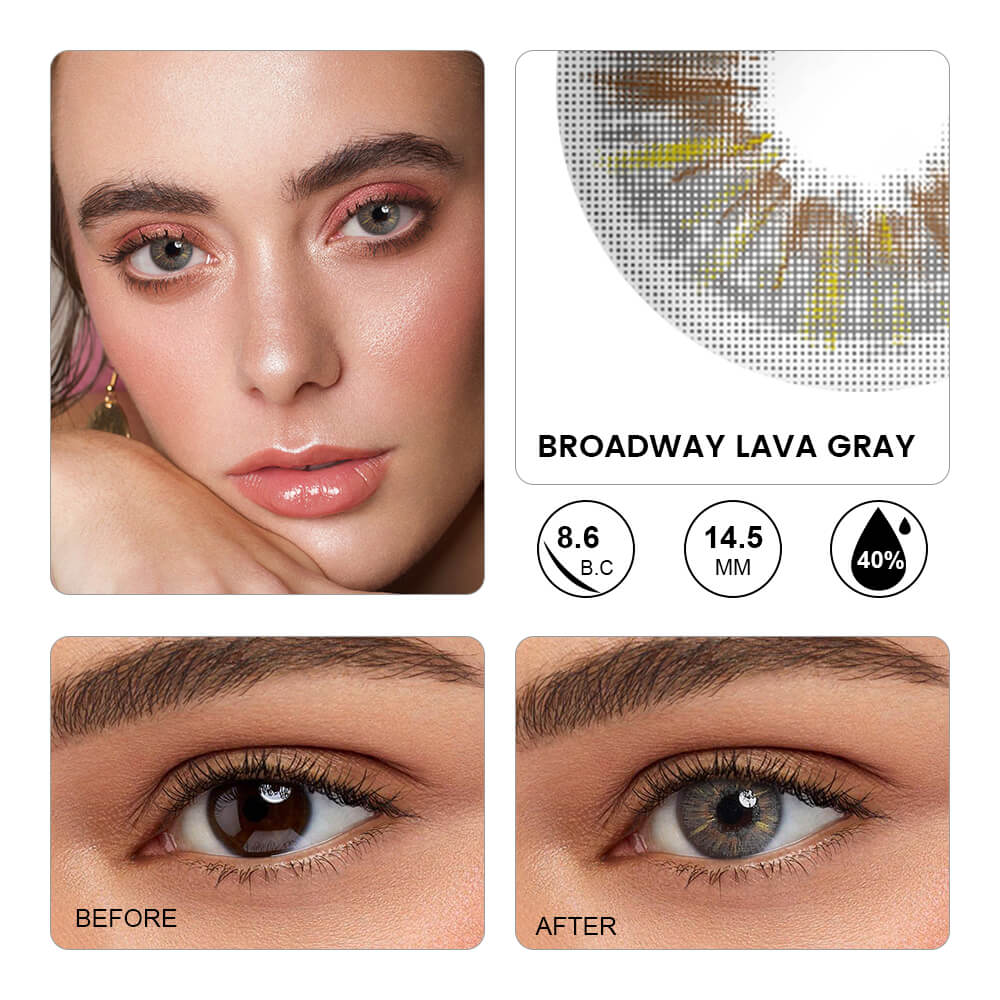 Broadway Lava Gray Contact Lenses are the ultimate choice for those seeking a natural yet captivating transformation. Featuring a fading gray color without a limbal ring, these lenses enhance your eyes with a subtle, organic effect that looks effortlessly real.