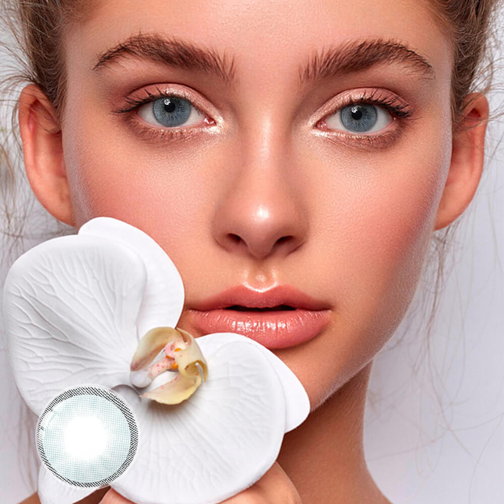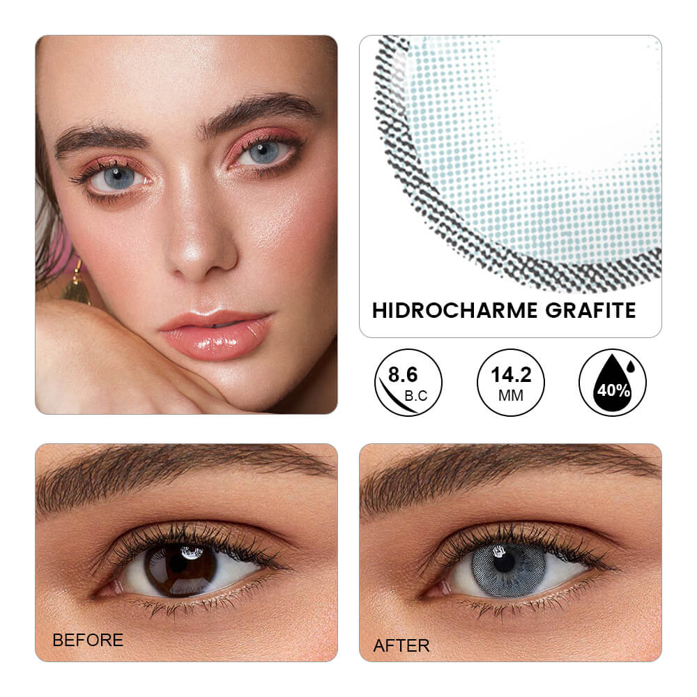Grafite Contacts feature a unique blend of blue and gray, offering a distinct and intriguing appearance. This special color mix adds depth and mystery to your eyes, making them undeniably captivating.