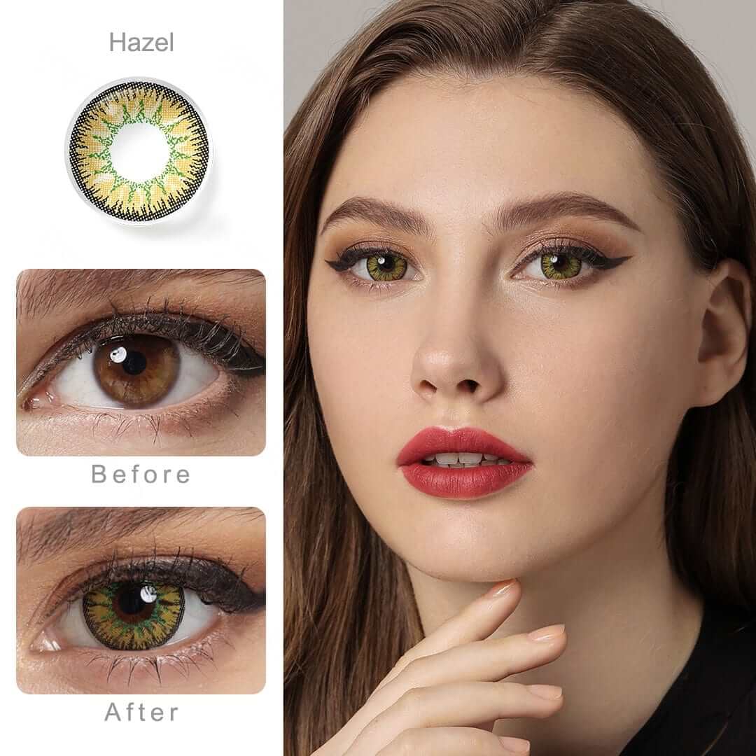 Nonno Hazel Contacts draw inspiration from the vast plains of Africa, combining a radiant emerald green starburst with a warm, sandy hazel background. This unique blend creates an eye-catching and exotic appearance that is truly one-of-a-kind.