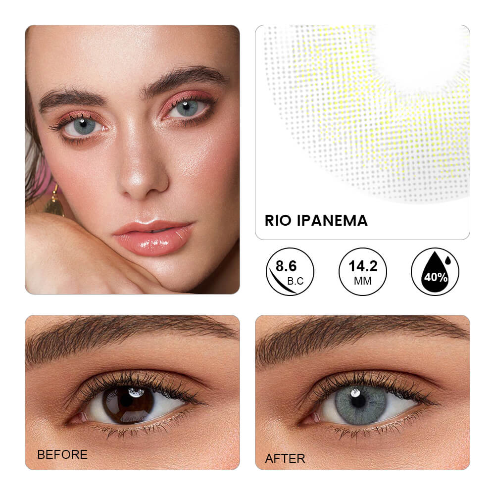 Rio Ipanema Contacts are crafted to bring a vibrant, yet natural look to your eyes. These lenses feature a warm yellow hue encircled by a soft light gray ring, creating a striking contrast that enhances your gaze with a subtle pop of color.
