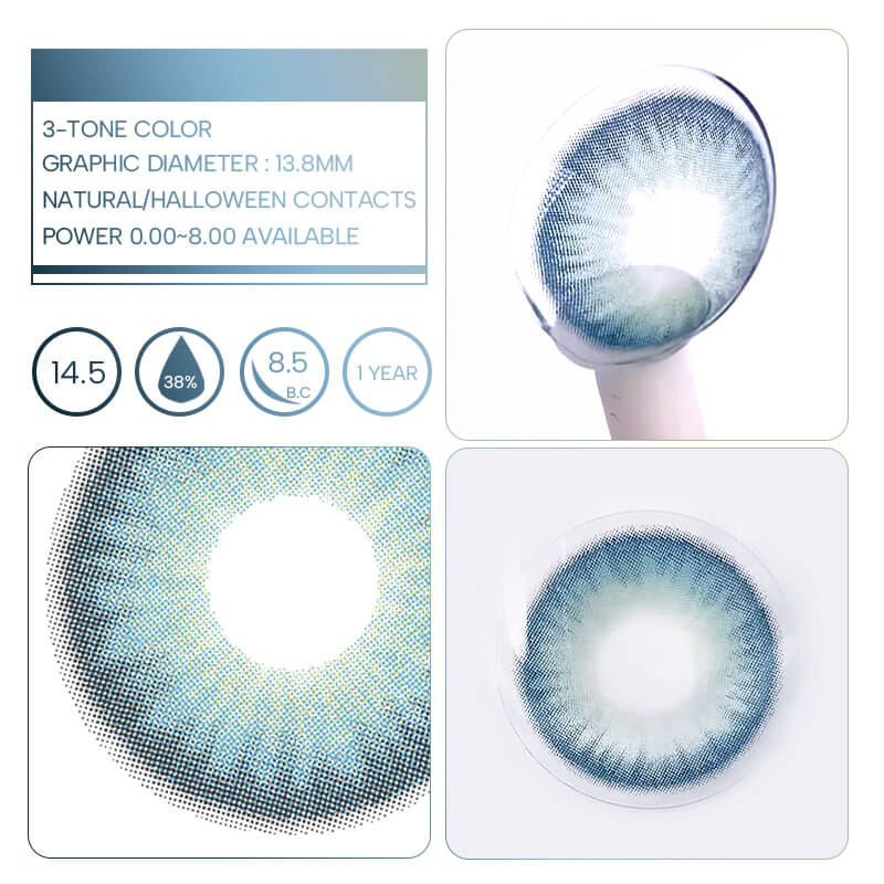 Make a striking statement with our high-pigment 3-tone colored contacts, expertly designed to deliver intense color payoff and mesmerizing depth for unforgettable eye transformations. With a generous 13.8mm graphic diameter, these lenses provide full iris coverage that's perfect for natural enhancement, Halloween looks