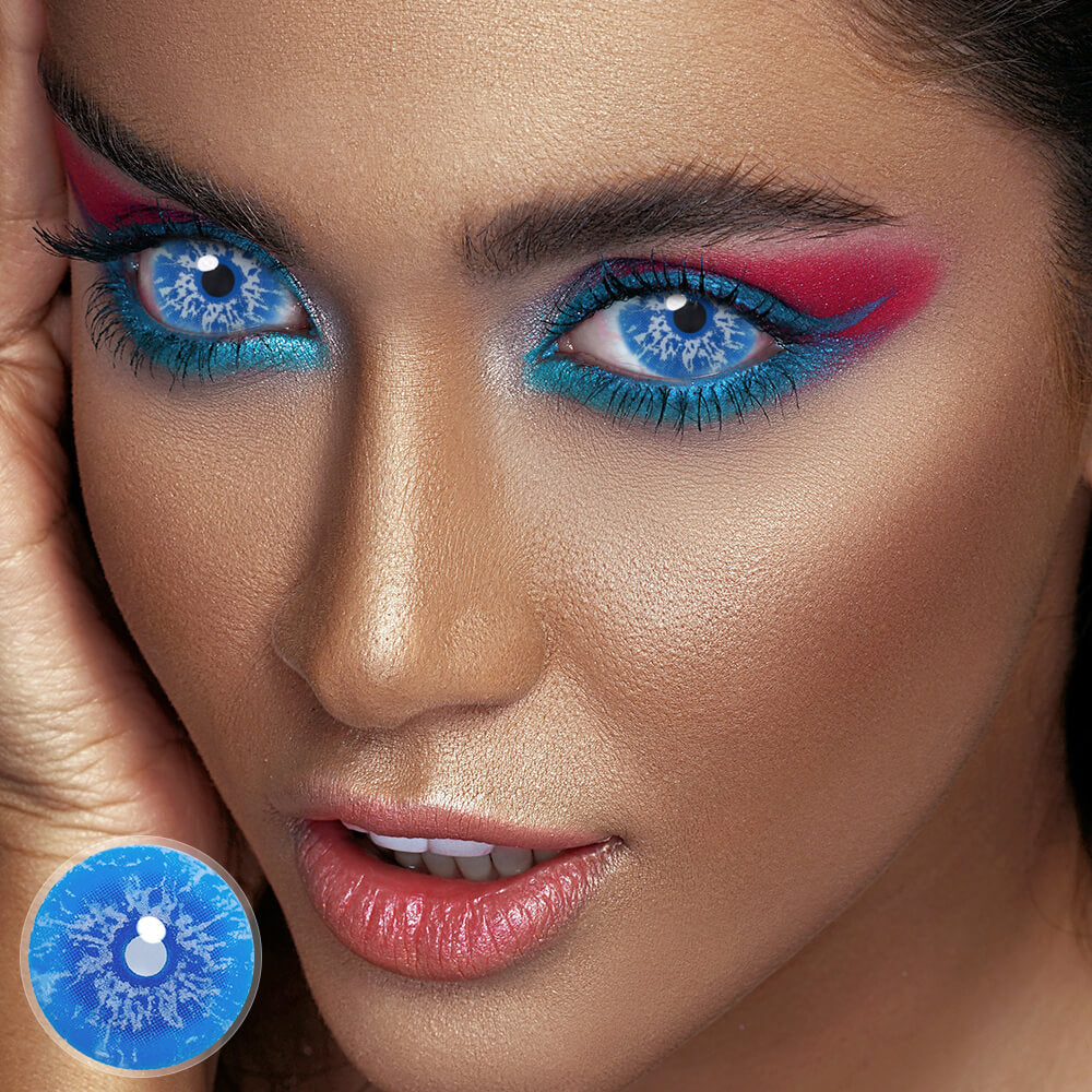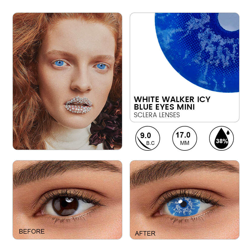 Get White Walker Mini Sclera Contacts for an icy blue, undead stare. Perfect for cosplay and Halloween creatures. Get yours now and unleash your frozen power!